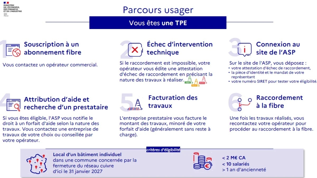 Initialement limitée aux communes concernées à court terme par la fermeture du réseau cuivre, l’aide expérimentale lancée le 29 septembre 2025 est désormais ouverte à tous les particuliers et TPE (entreprises de moins de 10 salariés et moins de 2M€ de chiffre d’affaires). Ce dispositif, piloté par la Direction générale des entreprises (DGE) et opéré par l’Agence de services et de paiement (ASP), vise à couvrir une partie des frais engagés pour ces travaux indispensables.